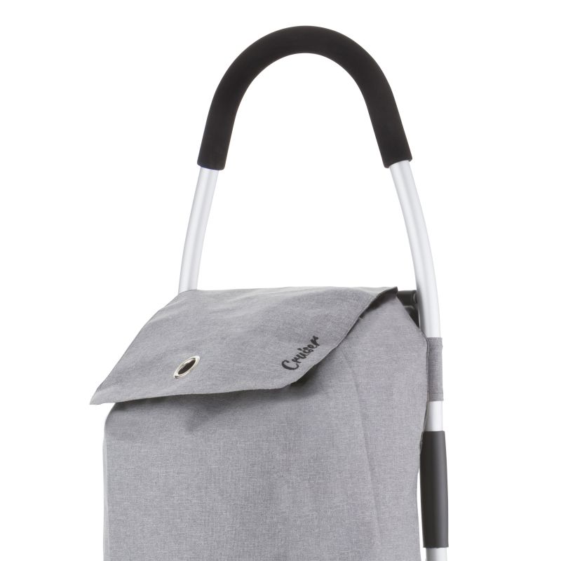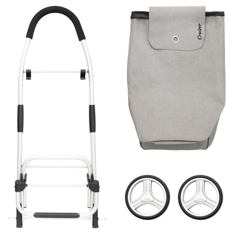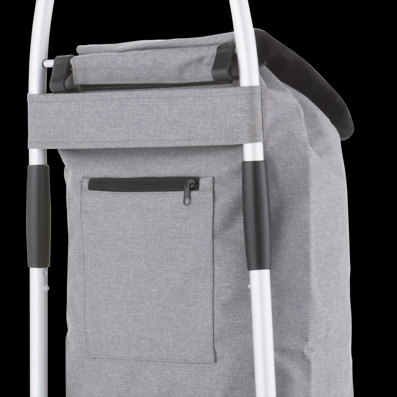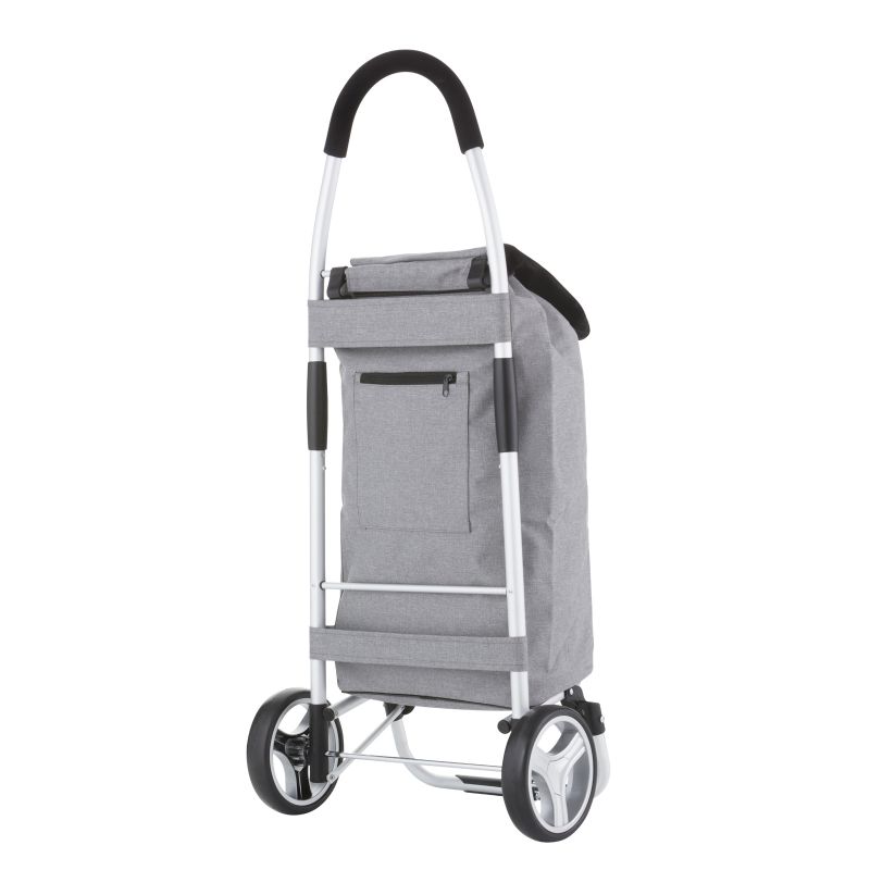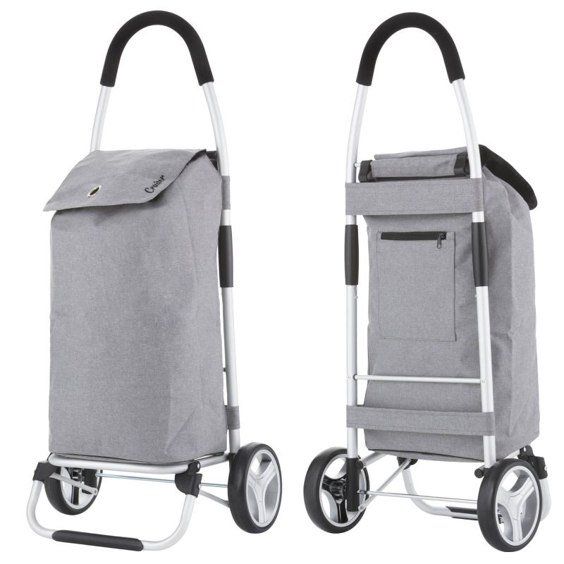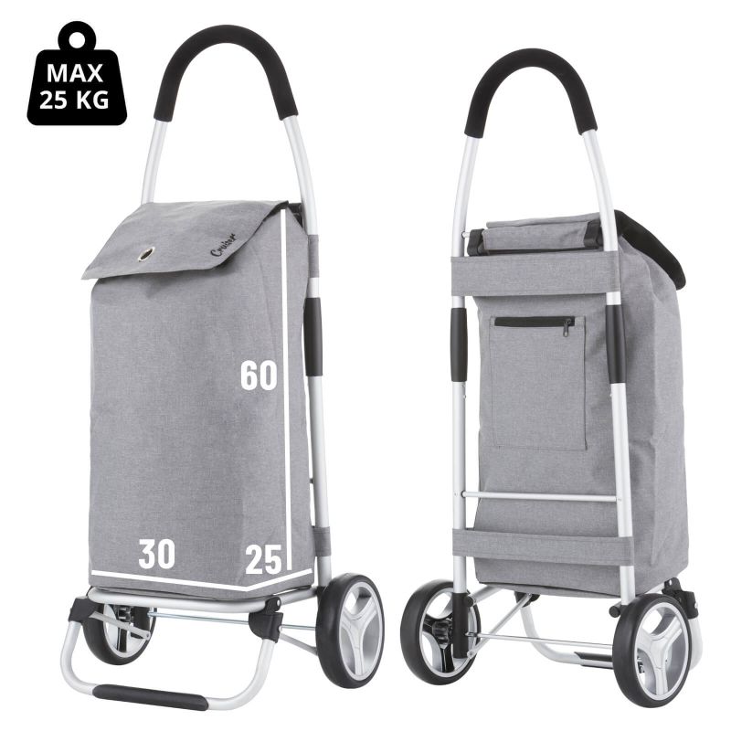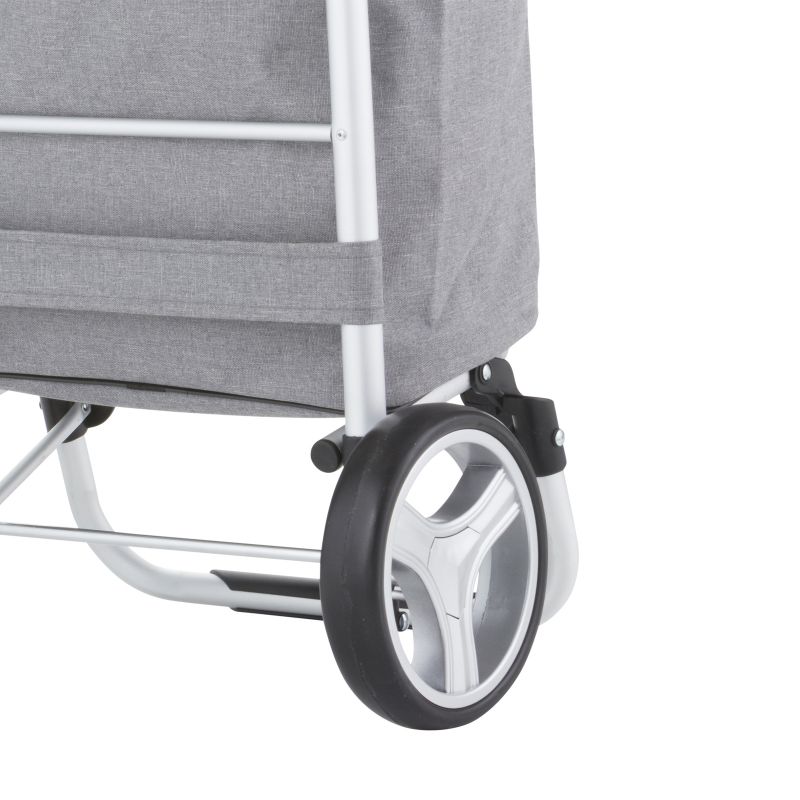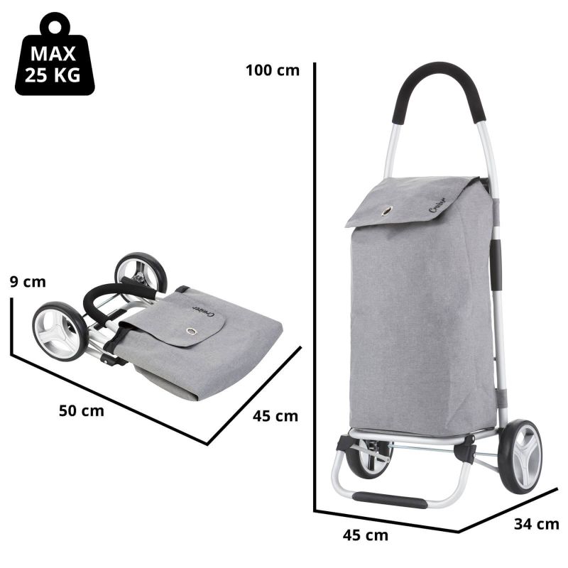Ein praktischer, leichter und geräumiger Einkaufswagen mit faltbarem Design. Er verfügt über ein geräumiges 40-Liter-Hauptfach mit Kordelzugverschluss und Klappe sowie eine zusätzliche Reißverschlusstasche auf der Rückseite. Ein verstärkter Boden, ein bequemer Griff, eine wasserdichte Konstruktion, große Räder für alle Oberflächen und ein schnelles und einfaches Falt- und Entfaltsystem sind seine Hauptvorteile.