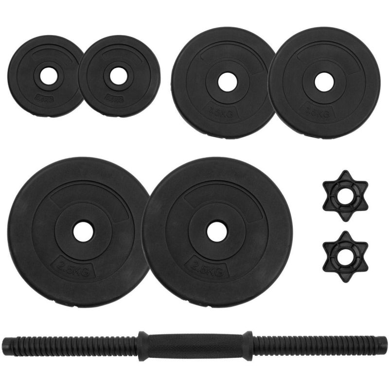 - Das Set enthält 2 Teller mit einem Gewicht von 2,5 kg, 2 Teller mit einem Gewicht von 1,5 kg und 2 Teller mit einem Gewicht von 0,5 kg.
