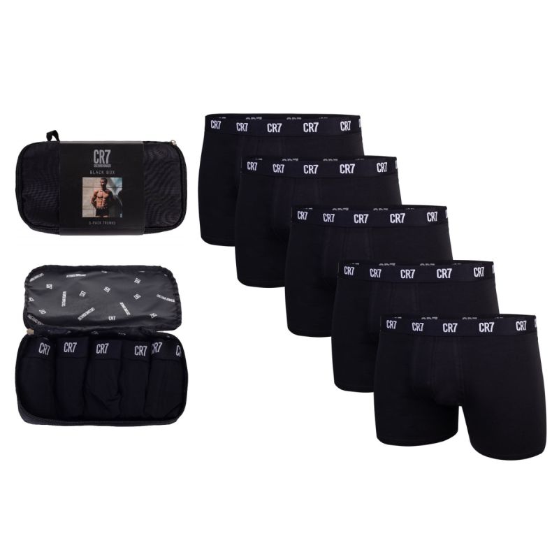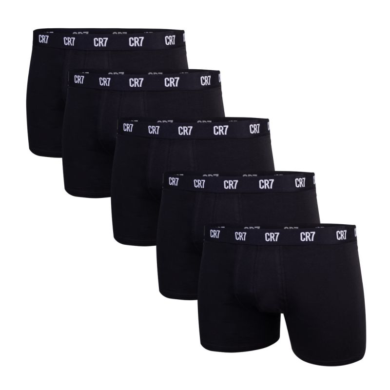Das Set beinhaltet fünf schwarze Boxershorts mit einem weißen CR7-Logo.