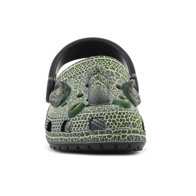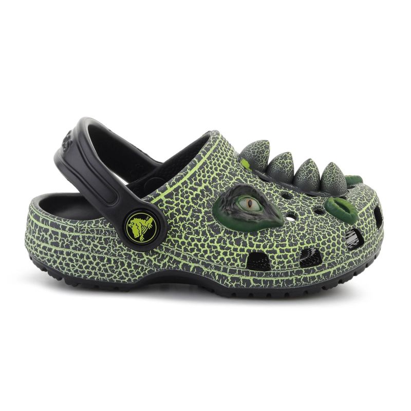 Die Crocs Classic I Am Scary Dino Clog T Kids Black 211372-001 sind Kinder-Sandalen, die speziell für kleine Dino-Fans entwickelt wurden. Dieses Modell besticht durch sein auffälliges Design, inspiriert von den prähistorischen Reptilien: Das Obermaterial ist mit einer Textur versehen, die an Dinosaurierschuppen erinnert, und Details wie Augen, Nasenlöcher und Stacheln runden den Look ab. Dieser einzigartige Stil verleiht den Schuhen einen unverwechselbaren Look und hilft Kindern, ihre Interessen beim Spielen auszuleben. Diese bequemen Kinder-Sandalen sind perfekt für jeden Tag geeignet – ob zu Hause, im Garten oder unterwegs. Ein verstellbarer Fersenriemen sorgt für optimalen Sitz und sicheren Halt. Die ikonische Crocs Comfort™-Technologie garantiert höchsten Tragekomfort: eine leichte und flexible Konstruktion, die für Rundum-Komfort sorgt. Der Crocs Classic I Am Scary Dino Clog ist ein leichter, verspielter und ausdrucksstarker Kinderschuh, der ein unverwechselbares Design mit dem bewährten Komfort des Klassikers vereint.
