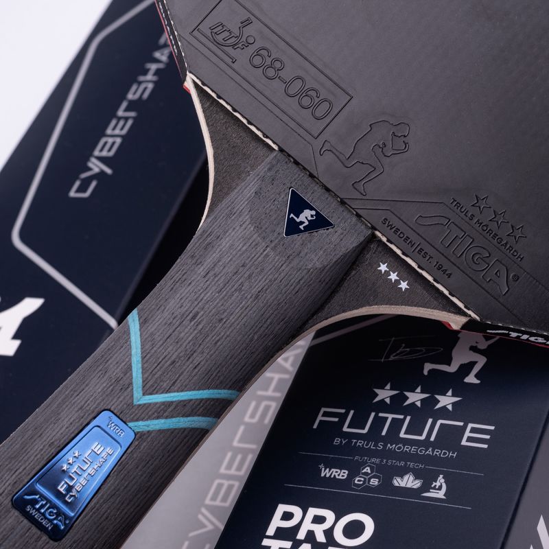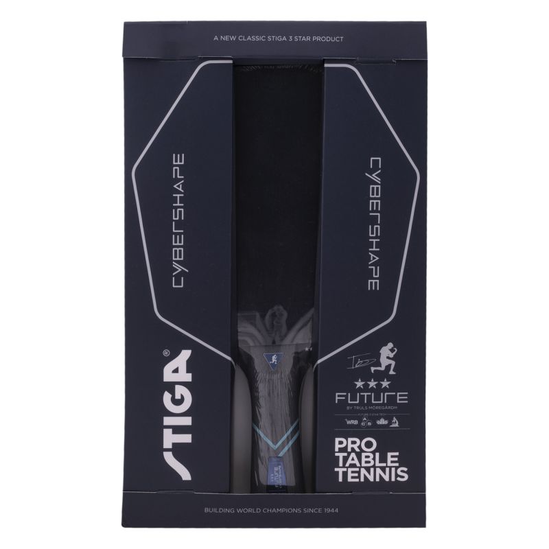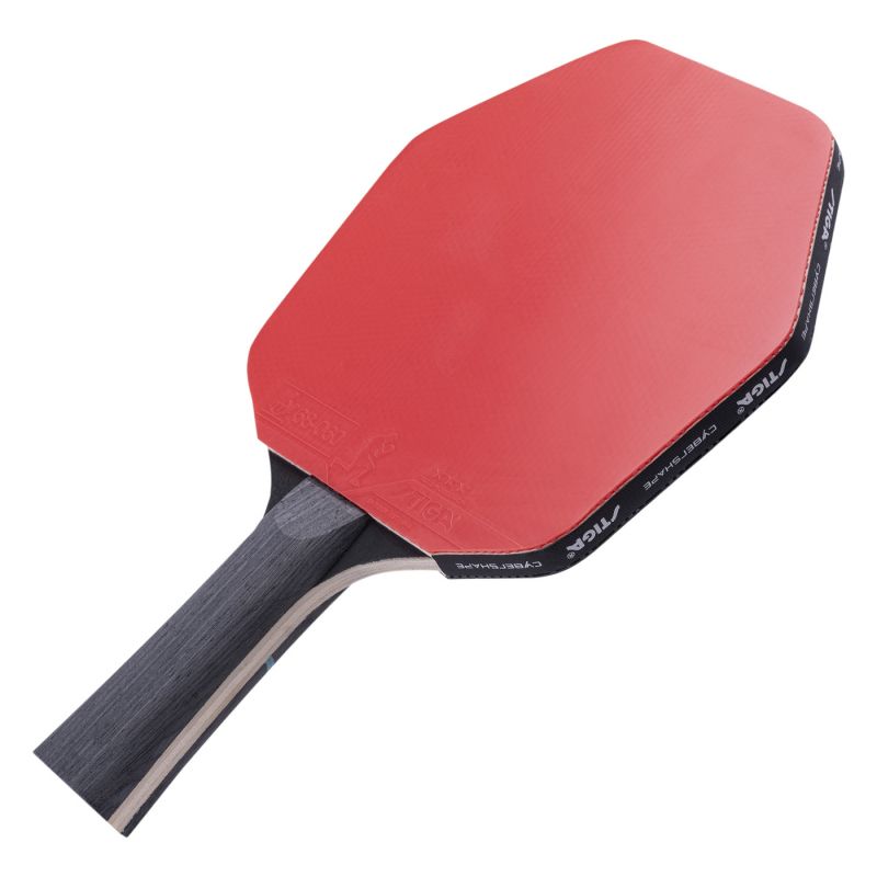 Ein Tennisschläger mit einzigartigem Cybershape-Design von Stiga, der die Schlagfläche an der Oberseite des Schlägerblatts maximiert. Konkaver Griff, 5-lagiges Holzblatt, 3-Sterne-ITTF-zugelassene Beläge und Gewicht: ca. 175 g.