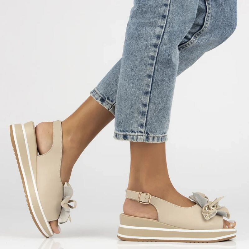 Die Sandalen haben einen bequemen Keilabsatz und sind somit die perfekte Ergänzung zu einem femininen Sommeroutfit.