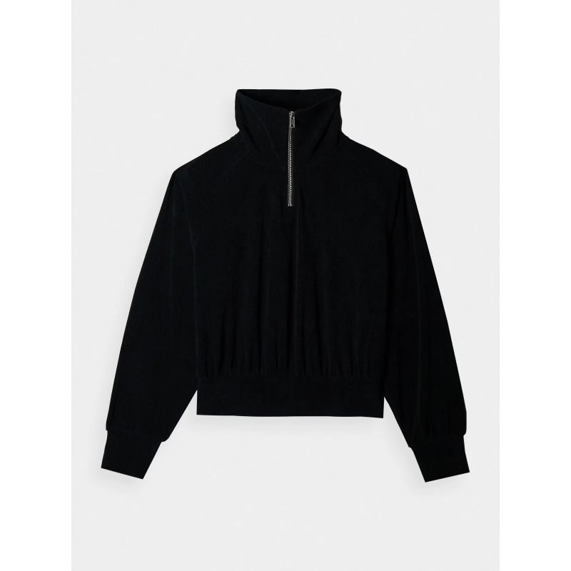 Dieses Damen-Sweatshirt mit offener Vorderseite ist aus leicht glänzendem Velours gefertigt. Velours zeichnet sich durch seine weiche, zarte Oberfläche aus. Es bietet zudem hohe Elastizität und Flexibilität und fällt sehr gut. Dank des Elasthan-Anteils von 5 % ist es dehnbar und sitzt bequem. Der Stehkragen ist mit Reißverschluss versehen. Bündchen und Saum sind gerippt. Klassische Passform ohne Taschen. Das Sweatshirt wird über den Kopf gezogen. Raglanärmel ermöglichen uneingeschränkte Bewegungsfreiheit.