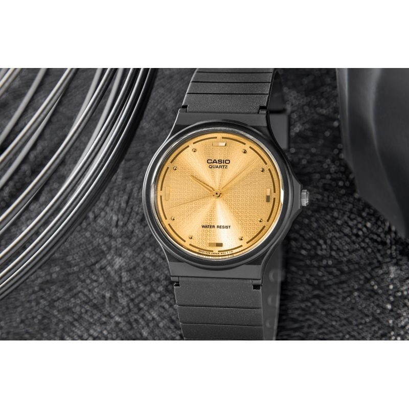 Entdecken Sie die gelungene Verbindung von klassischer Schlichtheit und modernem Design, die diese Uhr perfekt für elegante und legere Anlässe macht. Ihr schlankes Design und das kompakte Zifferblatt sorgen für einen optimalen Sitz am Handgelenk, während das matte, geschmeidige Harzarmband unvergleichlichen Tragekomfort bietet – weich, flexibel und strapazierfähig. Goldene rechteckige Indizes und dezente Punkte harmonieren perfekt mit dem warmen Goldton der Zeiger und schaffen eine stimmige und elegante Ästhetik. Und das bei einem Gewicht von nur 20 Gramm!
