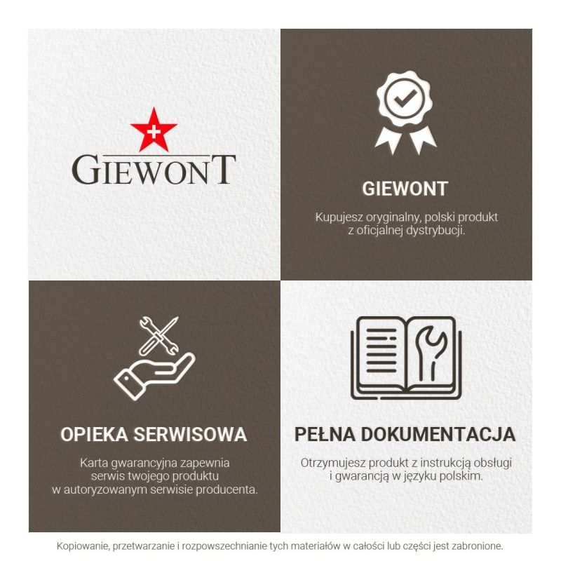 Die Marke Giewont entwickelt sich stetig weiter, und die Einführung einer Quarzuhrenkollektion ist der beste Beweis dafür. Wir produzieren weiterhin bewährte Smartwatch-Modelle und schreiben Geschichte, indem wir Sie in wichtigen Lebensmomenten begleiten, die Zeit messen und jeden Stil perfekt ergänzen.