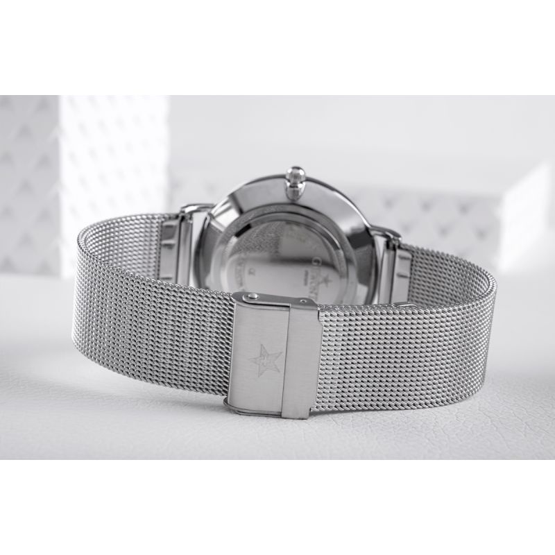 Ein komfortables Armband aus Edelstahlgewebe ergänzt diese Uhr perfekt. Es garantiert Langlebigkeit und hohen Tragekomfort im Alltag. Der hochwertige Edelstahl trägt zusätzlich zum angenehmen Tragekomfort bei und schmiegt sich perfekt an jedes Handgelenk an. Die Schließe ist mit dem Giewont-Logo versehen, was die Exklusivität der Uhr unterstreicht und sie von anderen Uhrenmarken abhebt.
