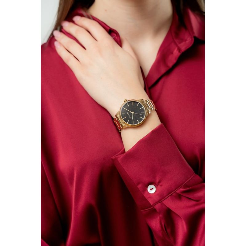 Die glatte, dezent schimmernde Oberfläche schmiegt sich harmonisch ans Handgelenk und sorgt für ganztägigen Tragekomfort. Die präzise Konturierung passt sich perfekt der weiblichen Hand an, betont dezent die schlanke Form des Handgelenks und verleiht jedem Outfit einen Hauch von Eleganz. Edelstahl vereint Langlebigkeit und Leichtigkeit und macht die Uhr dadurch besonders angenehm zu tragen. Das Armbanddesign vereint Luxus und schlichte Eleganz und macht die Uhr somit ideal für Abendveranstaltungen und den Alltag. Das Paul Lorens Logo auf der Armbandschließe rundet den Look ab.