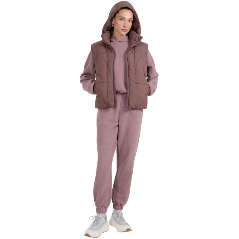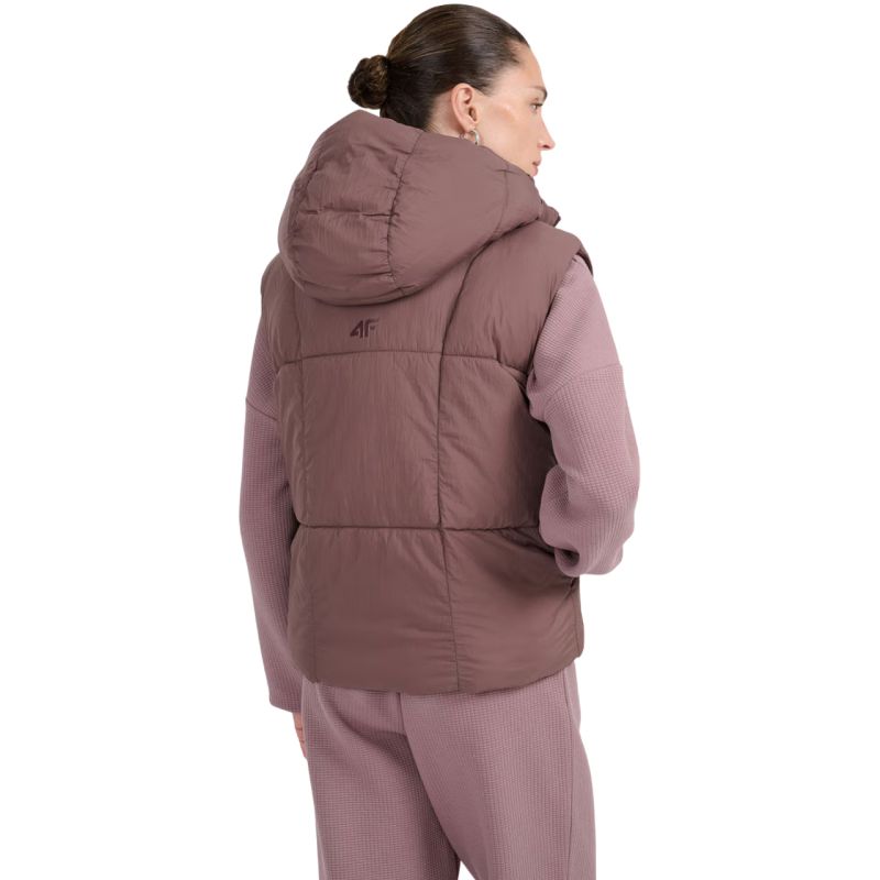 Damenweste 4F F299 dunkelbraun 4FWAW25TVJAF299 80S Die 4F Damenweste ist ein praktisches Kleidungsstück für die Übergangszeit und bietet außergewöhnlichen Tragekomfort. Technische Daten: Hauptmaterial: 100 % Polyester, Futter: 100 % Polyester, Füllung: 100 % Polyester (synthetische Daunen). Hydrophobe Außenbeschichtung – schützt das Material vor Feuchtigkeit und leichtem Regen. Leichte Polyesterisolierung – wärmt angenehm, ohne zu beschweren, und ist pflegeleicht. Gesteppte Einsätze – verleihen der Weste Charakter und verteilen die Isolierung gleichmäßig. Abnehmbare, verstellbare Kapuze – individuell anpassbar und für verschiedene Wetterbedingungen geeignet. Stehkragen – zusätzlicher Schutz vor Kälte und Wind. Ein-Wege-Reißverschluss vorne – für einfaches und schnelles An- und Ausziehen. Zwei offene Seitentaschen – für schnellen Zugriff auf Kleinigkeiten und als praktische Ablage für die Hände. Verstellbarer Saum mit Kordelzug – der Tunnelzug mit Stoppern ermöglicht die Anpassung des Umfangs. Normale Passform – schmiegt sich an den Körper an, ohne einzuengen.