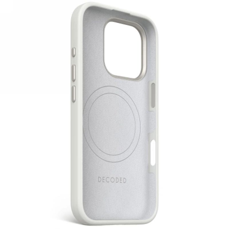 DECODED IST ZEITLOSES DESIGN Decoded kreiert luxuriöse Accessoires für mobile Geräte, die sich durch eine harmonische Kombination aus klassischem Design und fortschrittlicher Funktionalität auszeichnen. Jedes Decoded-Gehäuse ist mit zarten Akzenten versehen, die ihm ein einzigartiges Aussehen verleihen. SCHUTZ MIT GUTEM STIL Die Decoded-Hülle besteht aus hochwertigem Flüssigsilikon mit seidig glatter Oberfläche. Durch die Verwendung dieses Materials wird die Farbe des Gehäuses hervorgehoben, was zu einem einzigartigen Stilakzent wird. ABSORBIERT STÖßE Die scheinbare Feinheit von Silikon ist tatsächlich resistent gegen die Auswirkungen von Stößen und bietet die perfekte Kombination aus leichtem Design und vollständigem Schutz des iPhones. Die innere Struktur der Hülle absorbiert effektiv die Aufprallkraft, sodass das Gerät intakt bleibt, wenn das Telefon in die Hülle fällt. Das Gehäuse besteht aus Silikon mit antibakteriellen Eigenschaften. KEINE KRATZER Platzieren und bewegen Sie Ihr Telefon bedenkenlos auf einem Schreibtisch, Tisch oder einer anderen ebenen Fläche. Das Gehäuse verfügt über einen zweilagigen, eloxierten Metallring um die Kamera, wodurch die Objektive vor Kratzern geschützt sind. MAGSAFE UND KABELLOSES LADEN. Dank des im Gehäuse integrierten Magnetmoduls ist es mit der MagSafe-Funktionalität und den meisten kabellosen Ladegeräten kompatibel . Die Hülle gewährleistet eine genaue Positionierung des Telefons am Ladepunkt des kabellosen MagSafe-Ladegeräts. Platzieren Sie Ihr Telefon einfach an der Ladematrix und beide Geräte passen perfekt zueinander und sorgen für einen stabilen Ladevorgang.
