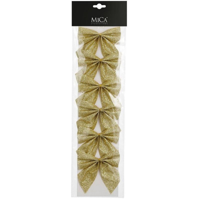Die goldene Dekoschleife von MICA (10 x 12 cm, 6 Stück) ist ein zeitloser Schmuck, der die festliche Stimmung und Eleganz Ihres Zuhauses unterstreicht. Mit diesem 6er-Set können Sie Ihren Weihnachtsbaum schmücken, Geschenke verpacken oder harmonische Weihnachtsdekorationen gestalten.