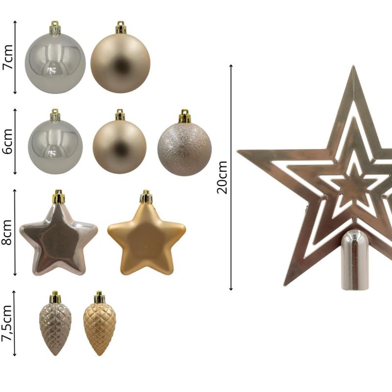 - Das Set beinhaltet: - Sternkreisel - 1 Stück, Kugel/Kiefernzapfen - 5 Stück/7,5 cm, Kugel mit einem Durchmesser von 6 cm - 17 Stück, Kugel mit einem Durchmesser von 8 cm - 8 Stück, Kugel mit einem Durchmesser von 7 cm - 9 Stück, Sternkugel mit einem Durchmesser von 8 cm - 8 Stück.
