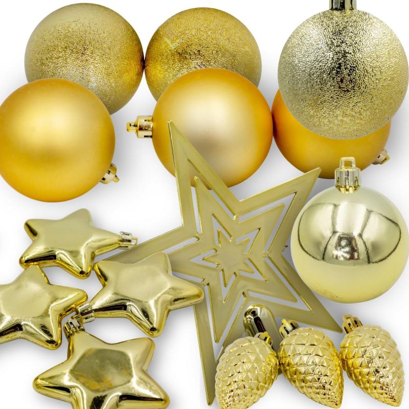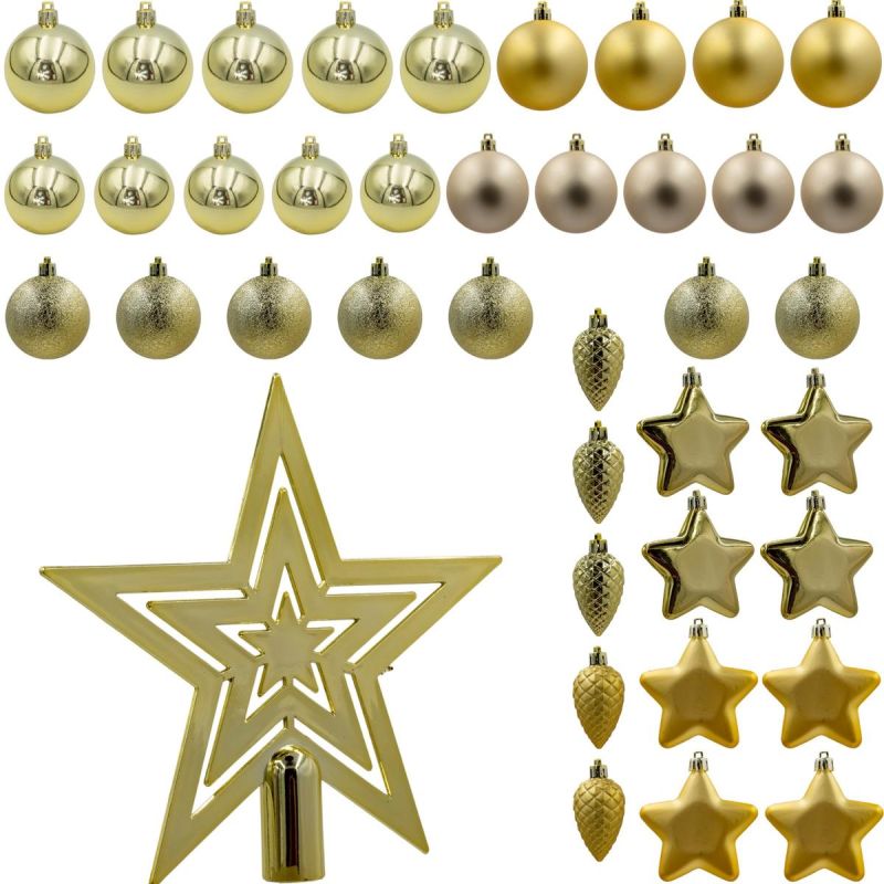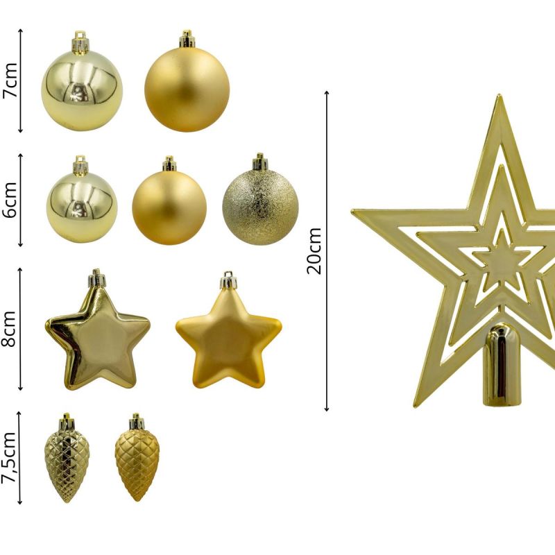 - Das Set beinhaltet: - Sternkreisel - 1 Stück, Kugel/Kiefernzapfen - 5 Stück/7,5 cm, Kugel mit einem Durchmesser von 6 cm - 17 Stück, Kugel mit einem Durchmesser von 8 cm - 8 Stück, Kugel mit einem Durchmesser von 7 cm - 9 Stück, Sternkugel mit einem Durchmesser von 8 cm - 8 Stück.