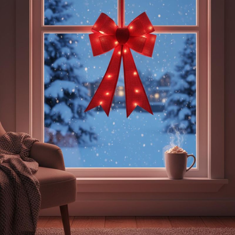 Diese 60 cm lange Dekoschleife mit 25 LEDs vereint Eleganz mit dem Zauber des Lichts. Sie ist batteriebetrieben und kann überall aufgehängt werden – an einer Tür, einem Weihnachtsbaum oder einem Fenster.