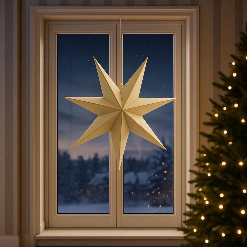 Suchen Sie eine einzigartige Weihnachtsdekoration im Geiste von Minimalismus und Ökologie? Der beigefarbene Dekostern MICA mit seinem imposanten Durchmesser von 75 cm und seiner leichten Papierkonstruktion ist die perfekte Wahl für moderne, natürliche Interieurs.