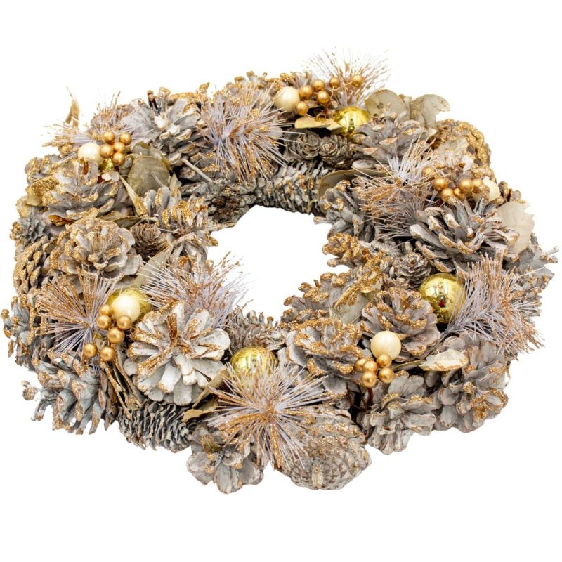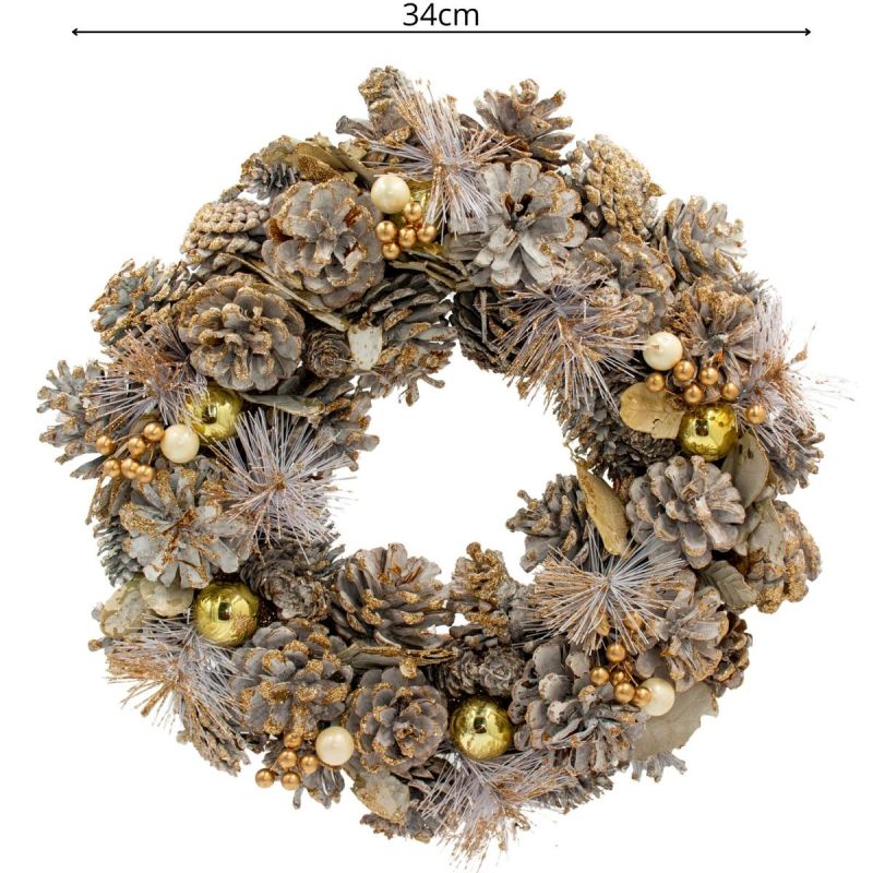 Der dekorative Kranz 34 cm Gold mit Kiefernzapfen und Glimmerkugeln ist eine fertige Dekoration mit natürlichen Kiefernzapfen und goldenen Akzenten, die Ihrem Zuhause im Handumdrehen Glanz, Stil und Weihnachtsstimmung verleiht.