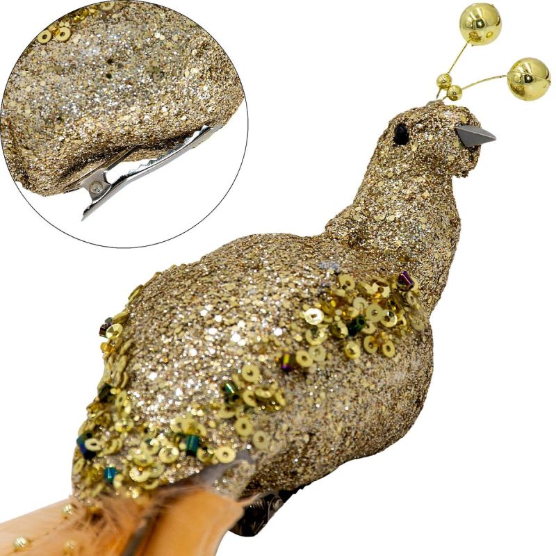 Der goldene Dekovogel an einer Klammer (38 cm) ist ein einzigartiges Schmuckstück, das mit seinem dezenten Glanz und seinem natürlichen Charme begeistert. Er eignet sich perfekt zum Dekorieren von Weihnachtsbäumen, Tischdekorationen, Kränzen oder Blumensträußen und verleiht jedem Arrangement eine leichte und elegante Note.