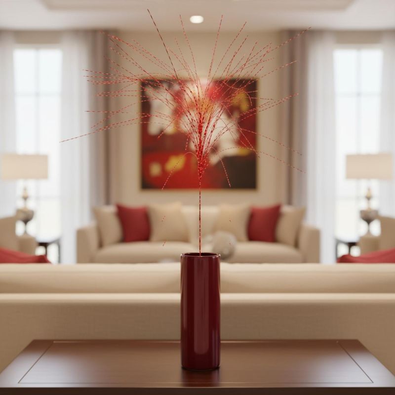 Platzieren Sie diesen schimmernden roten Deko-Zweig einfach in einer Vase oder einem Gesteck, um die Dekoration im Handumdrehen zu verwandeln. Die glänzende Oberfläche reflektiert das Licht wunderschön und sorgt so für einen glamourösen Effekt in Ihrem Zuhause, Büro oder Schaufenster.
