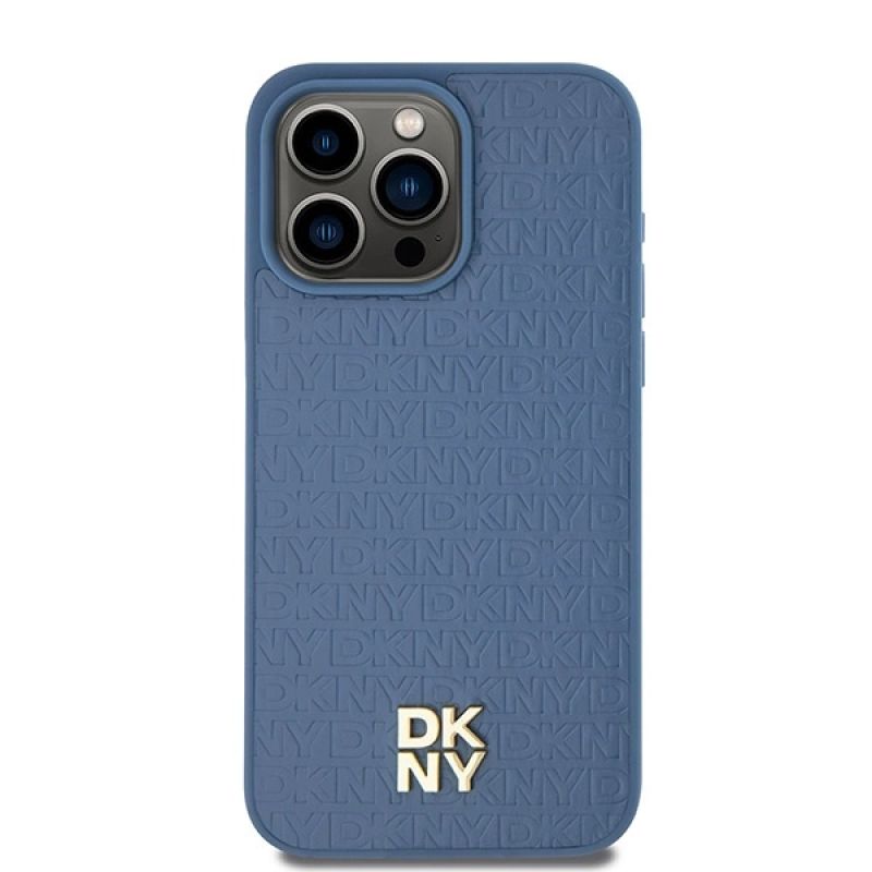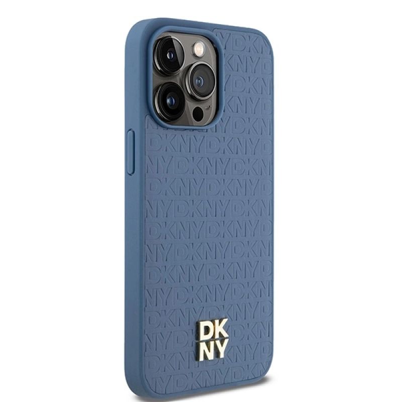 DKNY MagSafe-Hülle aus Leder mit Monogrammmuster und Metalllogo für iPhone 15 Pro Max – Blau