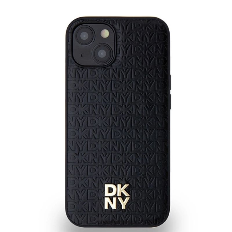 DKNY MagSafe-Hülle aus Leder mit Monogrammmuster und Metalllogo für iPhone 15/14/13 – Schwarz