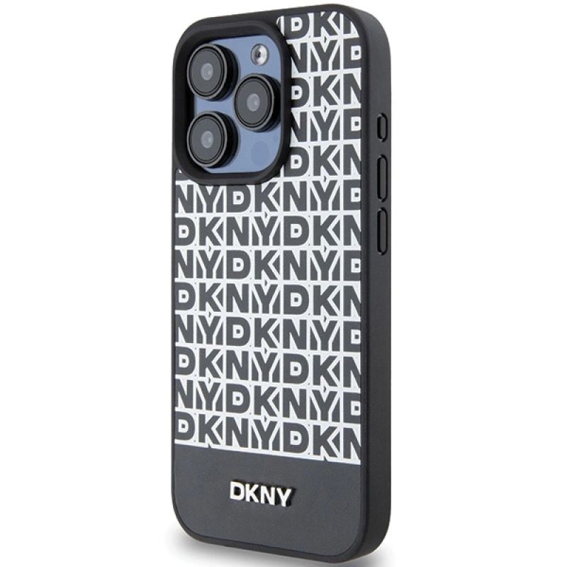 DKNY MagSafe Lederhülle mit bedrucktem Muster und Metalllogo für iPhone 15 Pro – Schwarz