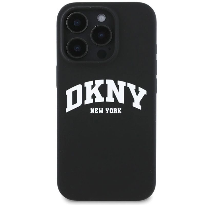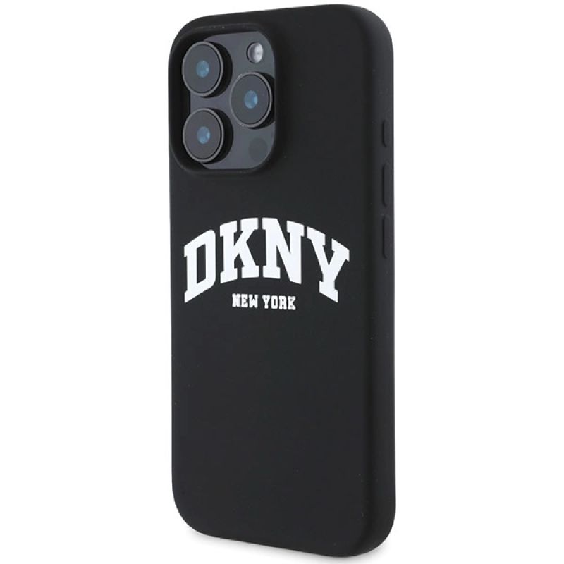 DKNY Silikon-MagSafe-Hülle mit weißem bedrucktem Logo für iPhone 16 Pro – Schwarz