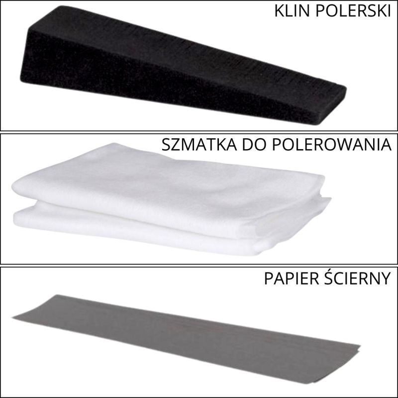 - Das Set beinhaltet: 1x Reparaturpaste – 25 g, 1x Finishpaste – 25 g, 4x Schleifpapierstreifen, 1x Polierkeil, 2x Poliertücher.