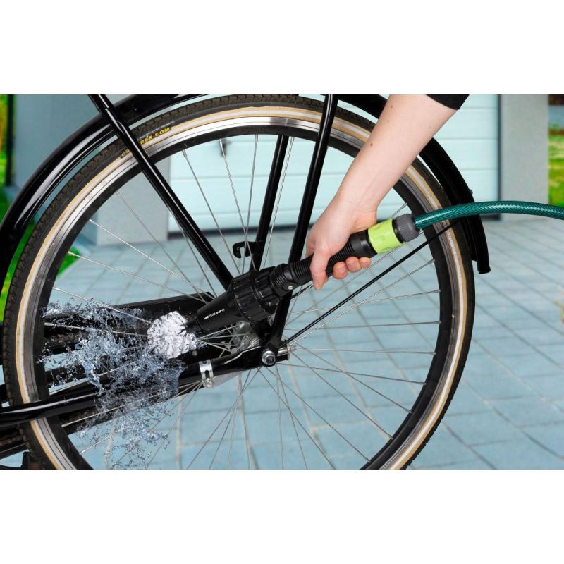Die Möglichkeit, die Bürste mit einem 3-Zoll-Schnellanschluss an einen Gartenschlauch anzuschließen, erlaubt es Ihnen, jeden Teil Ihres Autos oder Fahrrads unter fließendem Wasser zu reinigen und gleichzeitig Schmutz abzuspülen.