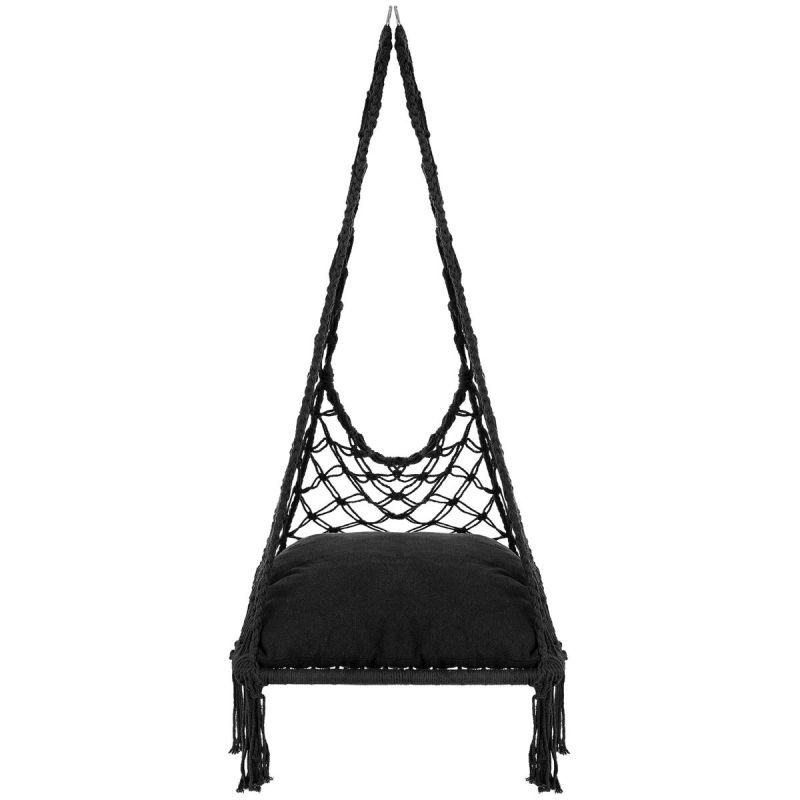 Der Hängesessel „Openwork Hammock“ (60 x 60 x 115 cm) mit dunkelgrauem Kissen von Saska Garden ist ein stilvoller und bequemer Ort zum Entspannen, ideal für drinnen und draußen. Seine robuste Konstruktion, das weiche Kissen und das elegante Design garantieren Komfort, Langlebigkeit und Vielseitigkeit.