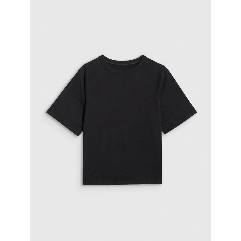 Der Rundhalsausschnitt ist mit einer leichten Rippenblende versehen und die Raglanärmel betonen den sportlichen Charakter und erhöhen die Bewegungsfreiheit.