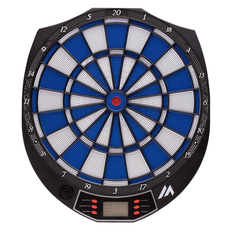 ELEKTRONISCHES DARTBOARD LCD-DISPLAY ABMESSUNGEN: 43 x 37,8 x 2,1 cm GEWICHT: 1,5 kg MATERIALZUSAMMENSETZUNG: BOARD: PP BUTTON: ABS LCD: GLAS DART: - BARREL: EISEN - SCHAFT: POM - BLATT: KUNSTSTOFF - SPITZE: POM SPEZIFIKATIONEN: - BATTERIE: 3 x AA 1,5 V - 159 SPIELE, 18 KATEGORIEN - 6 DARTS INKLUSIVE - BIS ZU 8 SPIELER