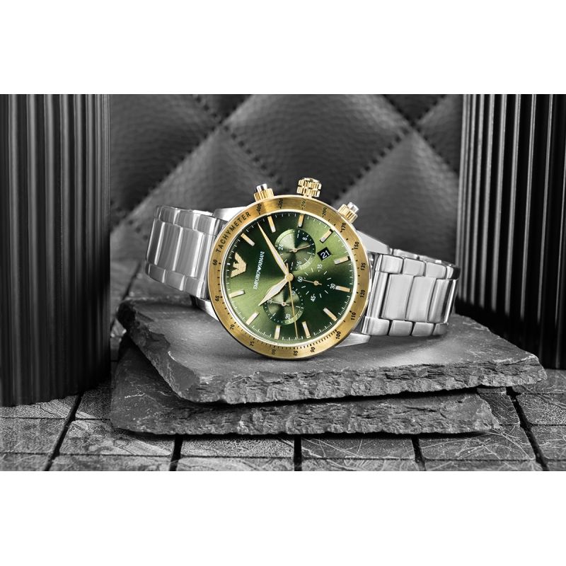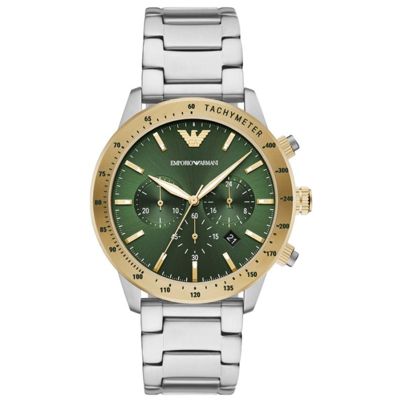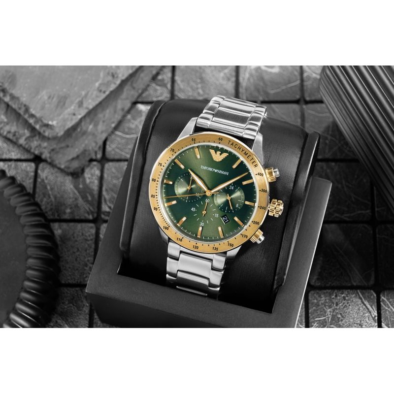 Die Emporio Armani Mario AR11454 Herrenuhr ist ein eleganter und vielseitiger Chronograph, der klassischen Stil mit modernem Charakter vereint. Das Edelstahlgehäuse harmoniert perfekt mit dem massiven Edelstahlarmband und sorgt für einen unverwechselbaren und zugleich vielseitigen Look. Das grüne Zifferblatt, die kontrastierenden Zeiger und Indizes sowie die Datumsanzeige unterstreichen die Präzision dieses Modells. Im Inneren der Uhr arbeitet ein Quarzwerk, das zuverlässigen Betrieb ohne tägliche Justierung gewährleistet, während die Chronographenfunktion präzises Zeitmessen ermöglicht. Dank der Wasserdichtigkeit bis 3 ATM ist die Uhr im Alltag vor Spritzwasser geschützt und somit die ideale Wahl für jeden Tag und formelle Anlässe.