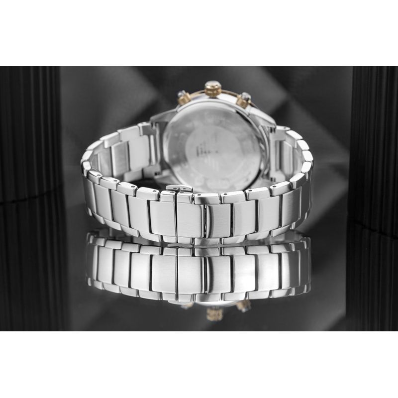 Das robuste Edelstahlarmband ist ein markantes Merkmal. Jedes Glied ist so gestaltet, dass es perfekt am Handgelenk sitzt und maximalen Tragekomfort bietet. Schlicht und edel zugleich, wirkt es raffiniert und robust – wie ein Stahlarmband, das die Uhr sicher am Handgelenk hält und Stabilität vermittelt. Jedes Glied ist sorgfältig gefertigt und passt somit perfekt zu legerer wie auch zu formeller Kleidung. Die präzise gefertigte Schließe unterstreicht den kraftvollen, maskulinen Charakter der Uhr.
