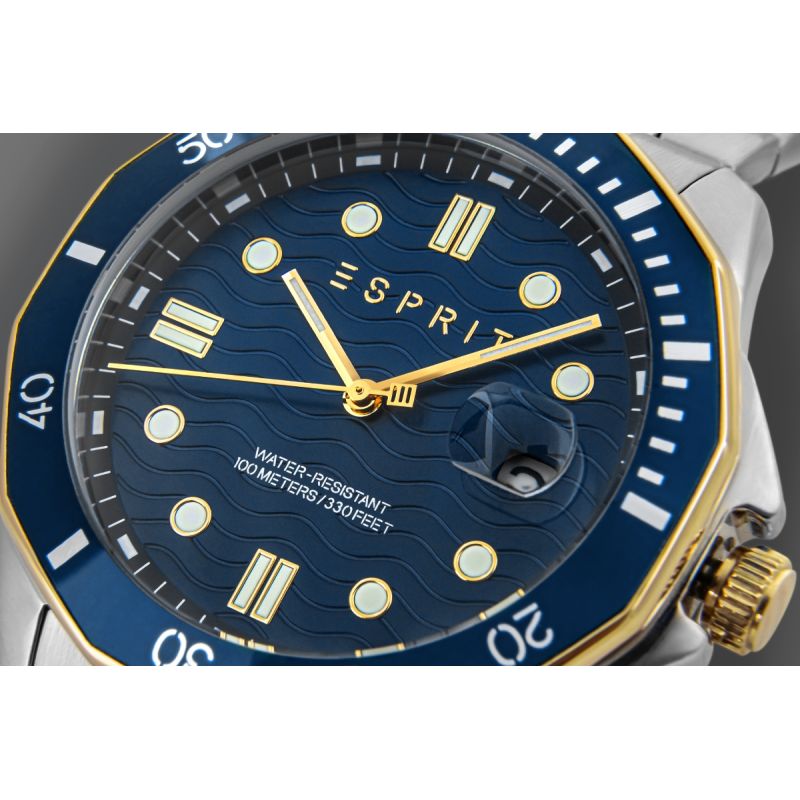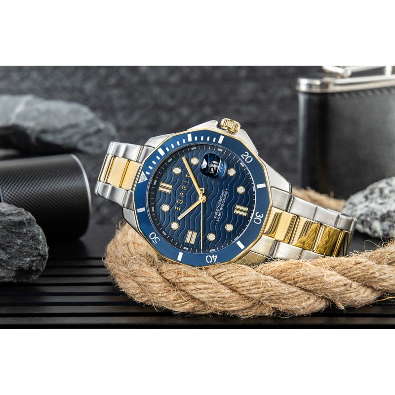 Wenn Sie das Design hochwertiger Uhren schätzen, aber kein Vermögen ausgeben möchten, bietet ESPRIT ein robustes Modell im Stil einer Luxus-Taucheruhr, das Sportlichkeit und Eleganz vereint. Das massive Edelstahlgehäuse und die markante, achteckige, marineblaue Lünette mit prominenten Minutenmarkierungen erinnern sofort an den Geist erstklassiger Sportuhren. Das Zifferblatt mit seinem von der Seefahrt inspirierten Wellenmuster, das zweifarbige Armband aus Gold und Edelstahl sowie die runden Goldindizes und die markanten, mit Leuchtmasse gefüllten Zeiger erinnern an den Stil der bekanntesten Uhren der Welt. Dies ist eine hervorragende Wahl für den Mann, der klassischen Stil liebt und gleichzeitig mit einem modernen, prestigeträchtigen Accessoire Eindruck machen möchte.