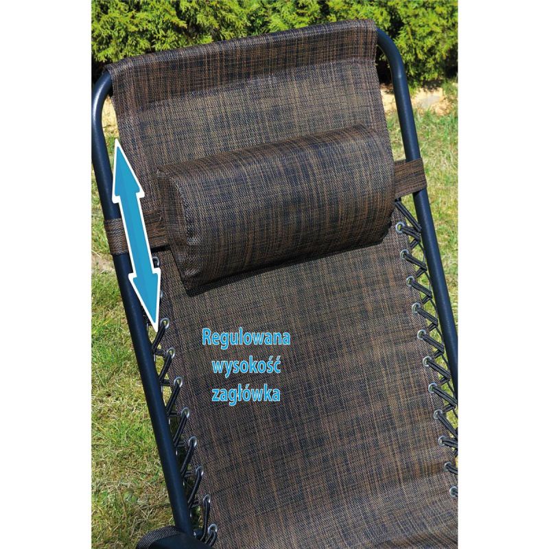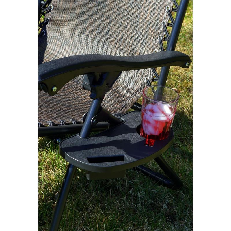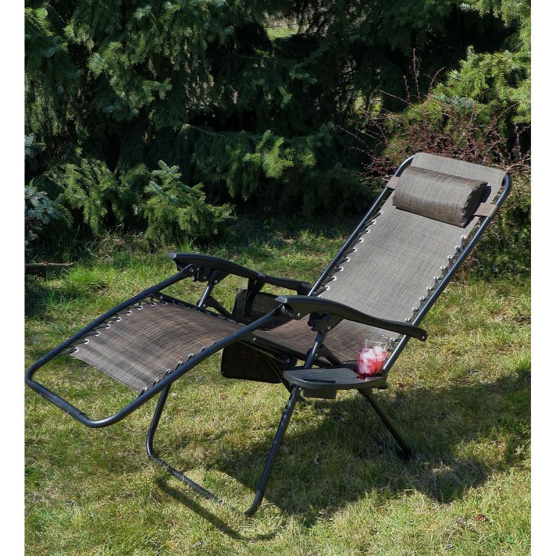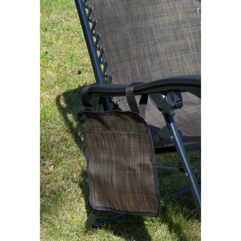 Die weiche Kopfstütze ermöglicht bequemes Anlehnen und eine komfortable Liegeposition. Eine Seitentasche bietet Platz für Zeitung oder Buch, und auf dem kleinen Tisch können Sie Kaffee, Saft oder Ihr Handy abstellen. Das Gestell des Stuhls besteht aus robustem und langlebigem Stahlrohr und trägt bis zu 120 kg!