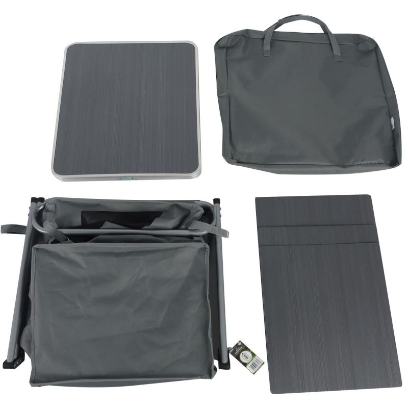 - Materialien: Oxford 600 D, MDF-Platte, 4,5 mm dicke Tischplatte und 3 mm dicke Regalböden, Stahl