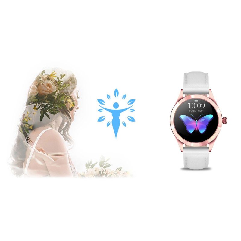 Und als Krönung des Ganzen lässt sich das Display mit fünf verschiedenen Designs personalisieren: Qualle, Schmetterling, aufwendiger Schmetterling, Kätzchen oder Blumenstrauß. Alle Designs sind feminin und dezent und bilden einen wunderschönen Kontrast zum dunklen Display. Jeder möchte so lange wie möglich gesund bleiben, und diese Smartwatch unterstützt Sie dabei. Sie misst Herzfrequenz und Blutdruck – ein fantastisches Tool zur Gesundheitsüberwachung .