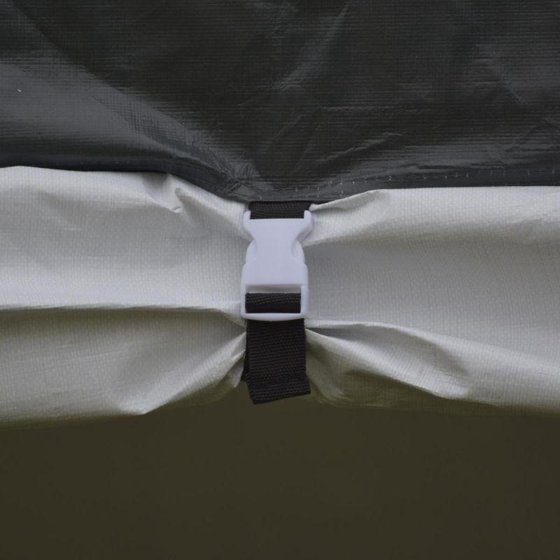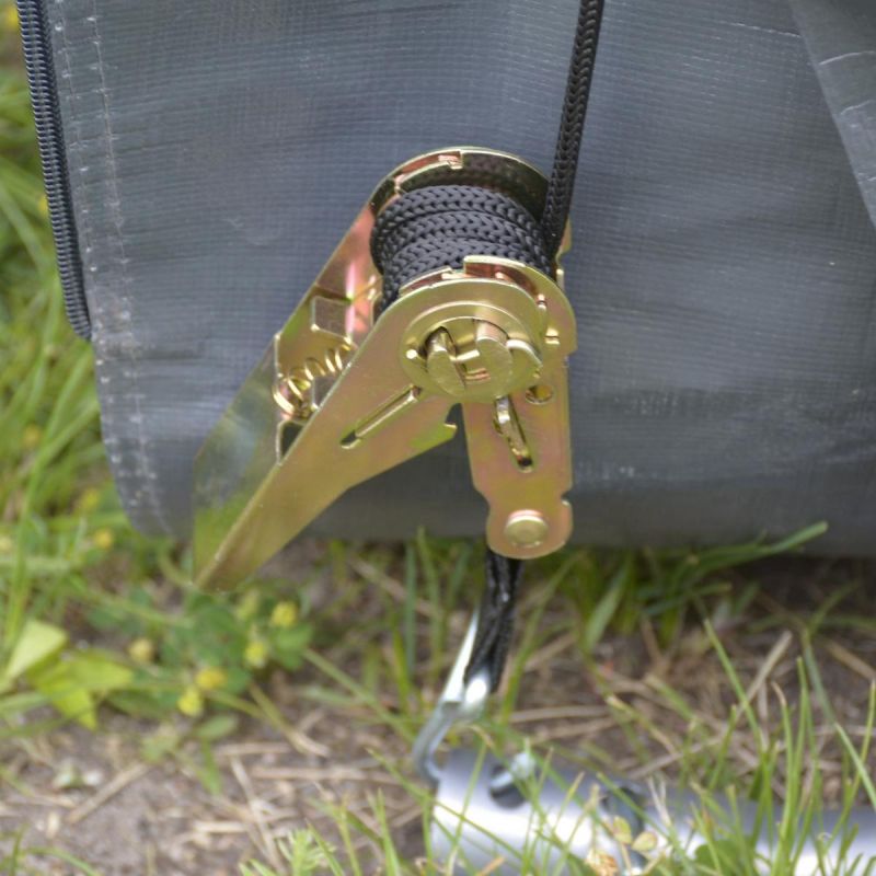 Die vier im Set enthaltenen praktischen Spannvorrichtungen ermöglichen ein einfaches Spannen des Dachmaterials und gewährleisten so dessen Stabilität auch bei Wind. Dies erhöht die Langlebigkeit des Pavillons und schützt vor Rissen in der Dachdeckung. Dadurch bleibt das ästhetische und gleichmäßige Erscheinungsbild des Daches erhalten.