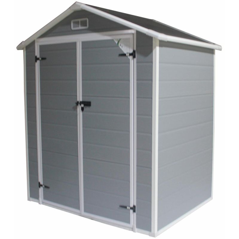 Der Geräteschuppen besteht aus 12 mm dickem, doppellagigem PVC und ist daher witterungsbeständig. Das Satteldach ist UV-beständig, und die Metallbeschläge sind pulverbeschichtet und korrosionsgeschützt.