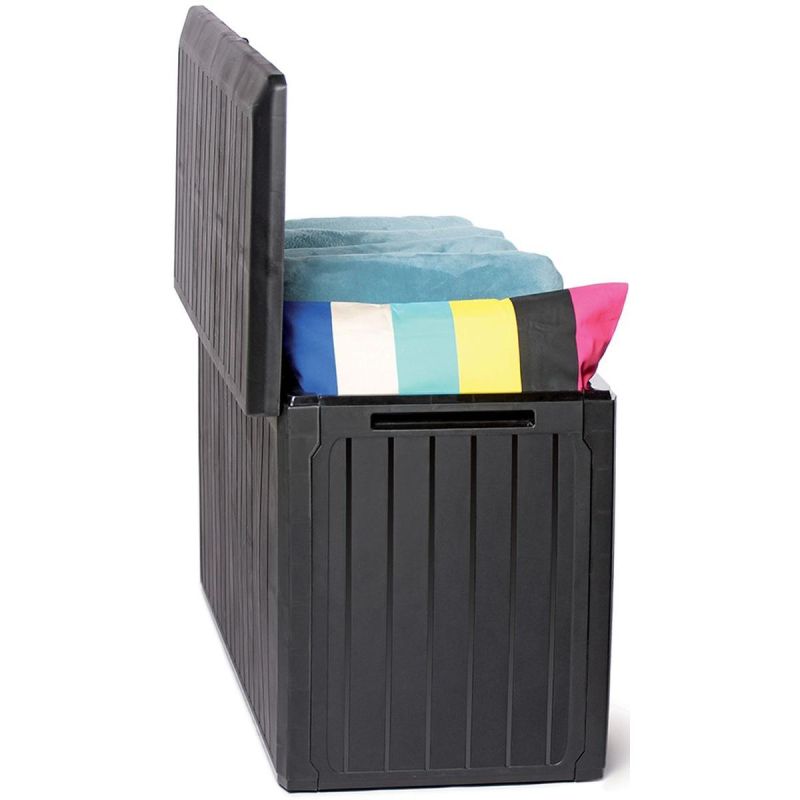 Suchen Sie nach Aufbewahrungsmöglichkeiten für Werkzeug, Decken oder Kissen auf Ihrer Terrasse, Ihrem Balkon oder in Ihrem Garten? Die 290-Liter-Gartenbox aus anthrazitfarbenem Karton ist perfekt für diesen Zweck geeignet und passt zu jeder Einrichtung.