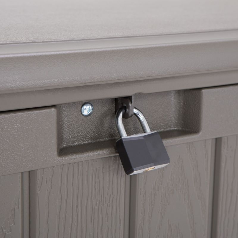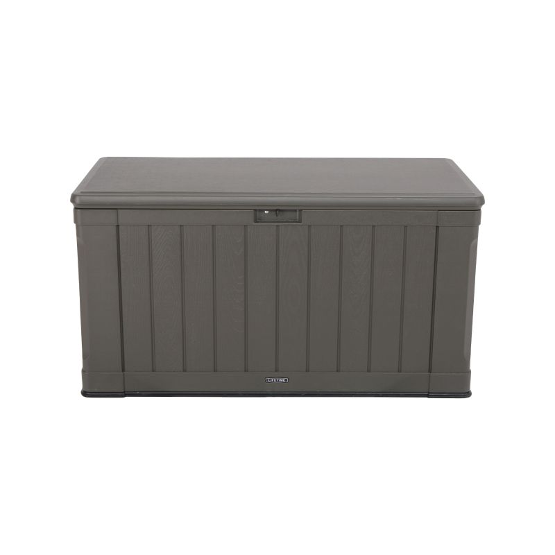 Dieses 439 Liter fassende Gartenlager wird mit einer 10-jährigen eingeschränkten Garantie von Lifetime geliefert. Es verfügt über ein ästhetisch ansprechendes Holzlattendesign.