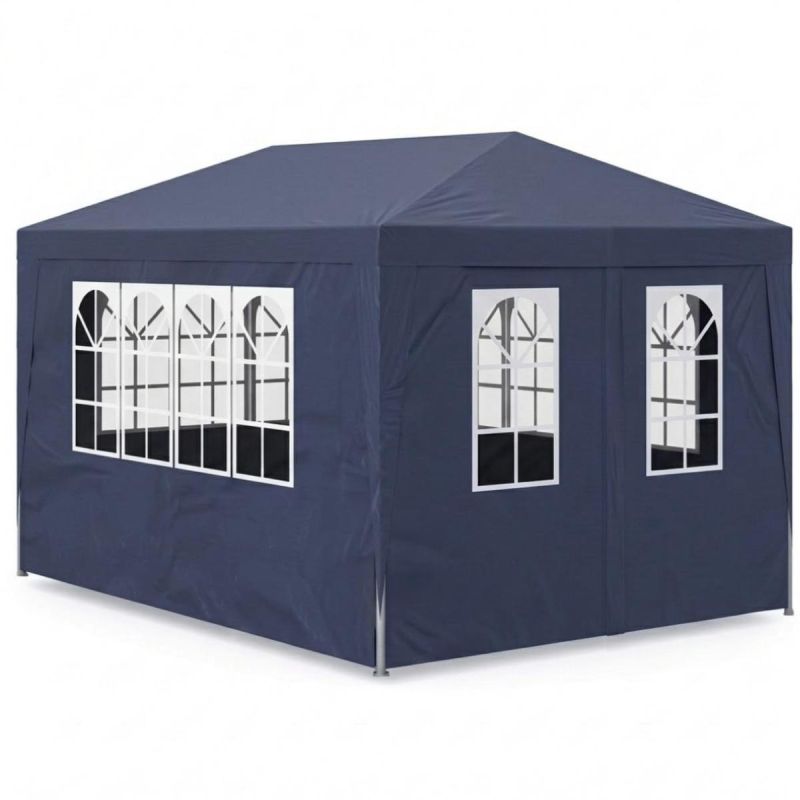 Der 3 x 4 x 2,5 m große, marineblaue Gartenpavillon ist eine stabile und geräumige Konstruktion, ideal für Veranstaltungen im Freien. Seine mit Folienpaneelen verkleideten Wände bieten Schutz und lassen natürliches Licht herein, wodurch ein eleganter Raum für jeden Anlass entsteht.