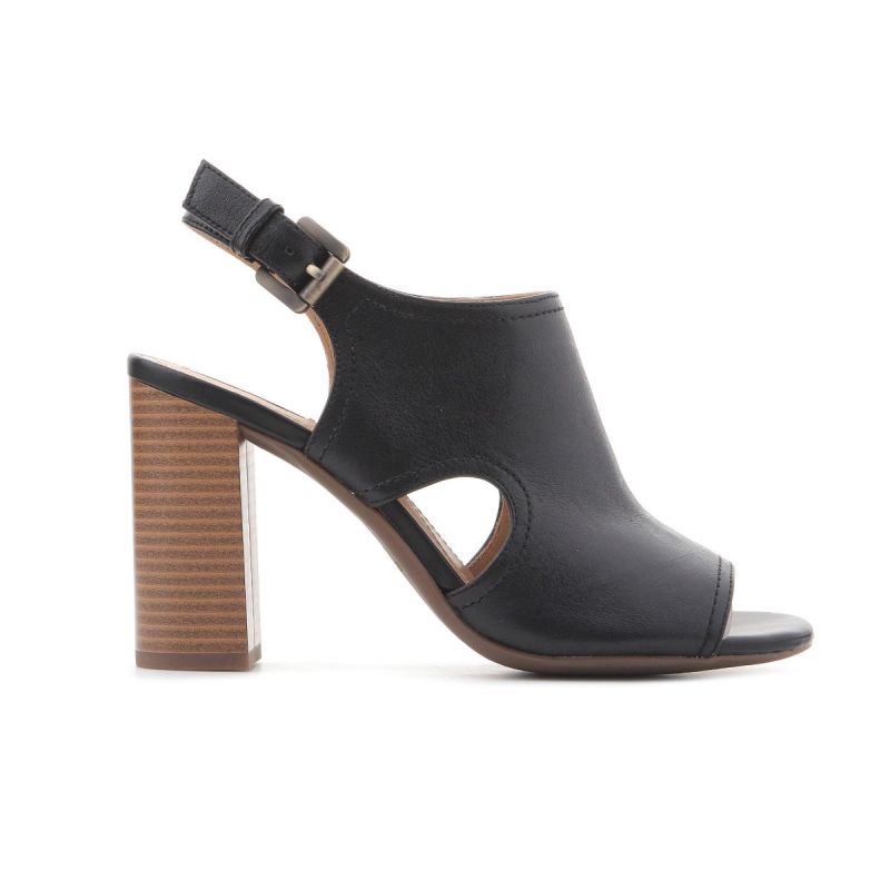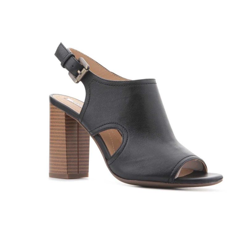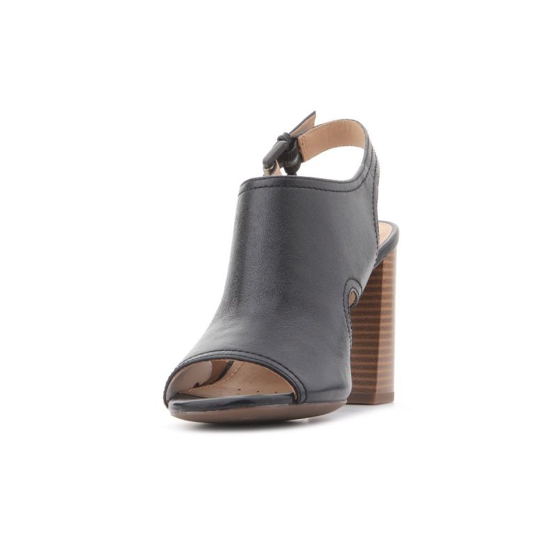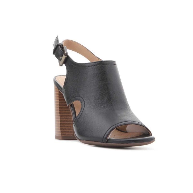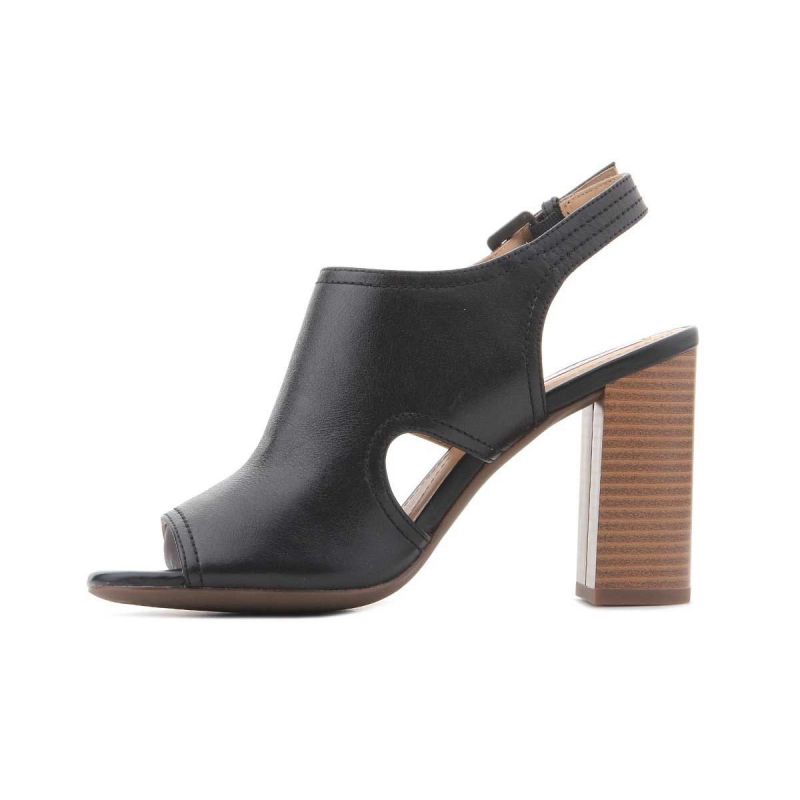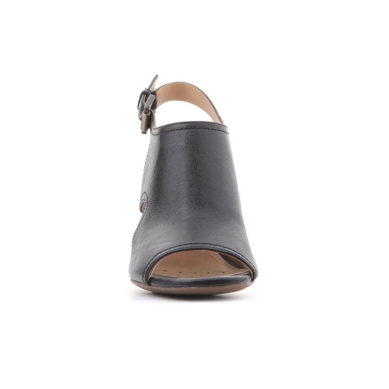 Schwarze Damenschuhe aus Leder mit 9 cm hohem Absatz. Das Obermaterial reicht bis über den Spann. Eine seitliche Metallschnalle ermöglicht die Regulierung des Fersenriemens. Stilvolle Eleganz! Geox Respira-Technologie – eine patentierte perforierte Sohle mit mikroporöser Membran, die Schweiß aufnimmt und ableitet, ohne dass Wasser in den Schuh eindringt.