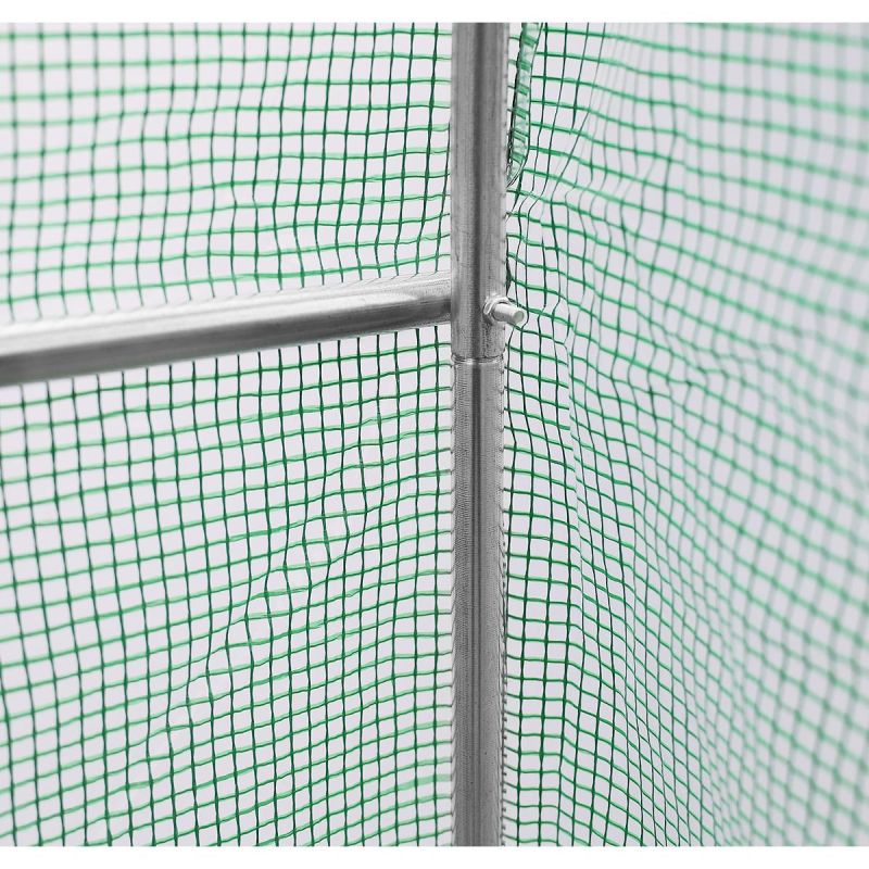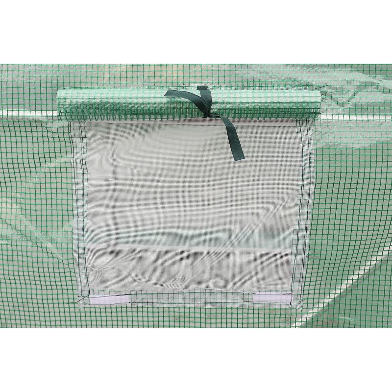 Das Gewächshaus ist durchdacht gestaltet. Es verfügt über vier Fenster mit Moskitonetzen und Folienvorhängen, die vor übermäßiger Feuchtigkeit schützen und gleichzeitig optimale Luftzirkulation und ausreichend Lichteinfall gewährleisten. Eine abschließbare Tür ermöglicht bequemes Betreten und Verlassen.