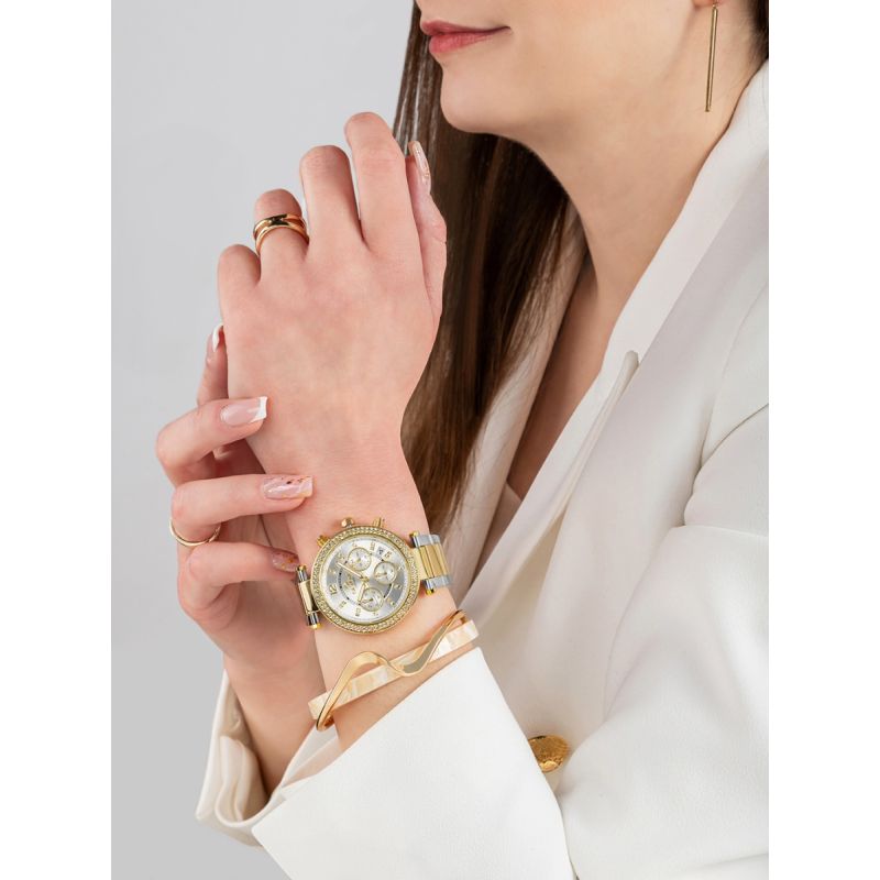 Das robuste Armband aus makellosem Edelstahl ist ein markantes Merkmal. Jedes Glied ist so gestaltet, dass es perfekt am Handgelenk sitzt und maximalen Tragekomfort bietet. Schlicht und edel zugleich, wirkt es elegant und robust – wie ein Stahlband, das die Uhr sicher am Handgelenk hält und an ihre Stabilität erinnert. Jedes Glied ist sorgfältig verarbeitet und passt somit perfekt zu legerer wie auch zu formeller Kleidung. Die präzise gefertigte Schließe unterstreicht den starken, femininen Charakter der Uhr.