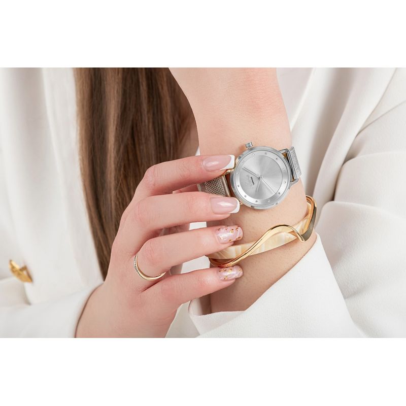 Das Mesh-Armband verfügt über einen praktischen, verstellbaren Verschluss, der eine präzise Passform ermöglicht. Diese Lösung vereint Ästhetik und Funktionalität und sorgt so für ganztägigen Tragekomfort.