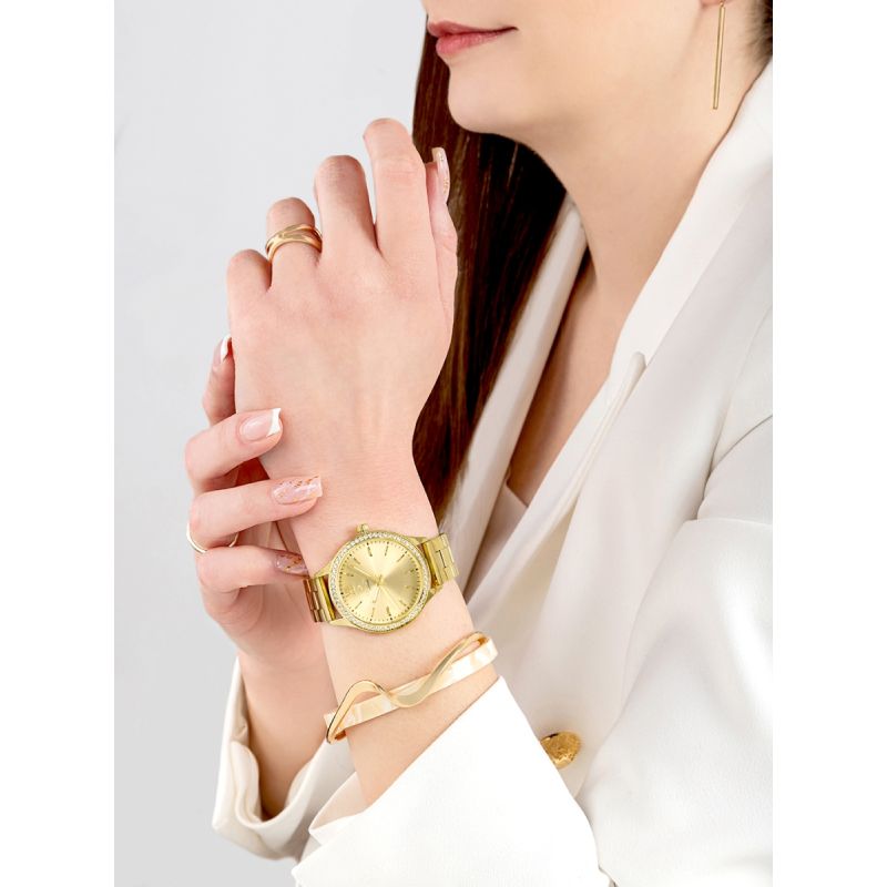 Das Zifferblatt besticht durch Klarheit und ästhetische Ausgewogenheit und macht die Uhr so nicht nur praktisch, sondern auch zu einem echten Hingucker. Das mit dezenten Zirkonen verzierte Gehäuse ist ein Blickfang und verleiht dem Gesamtdesign einen Hauch von Luxus. Es unterstreicht den femininen Stil auf subtile Weise, ohne dabei aufdringlich zu wirken.