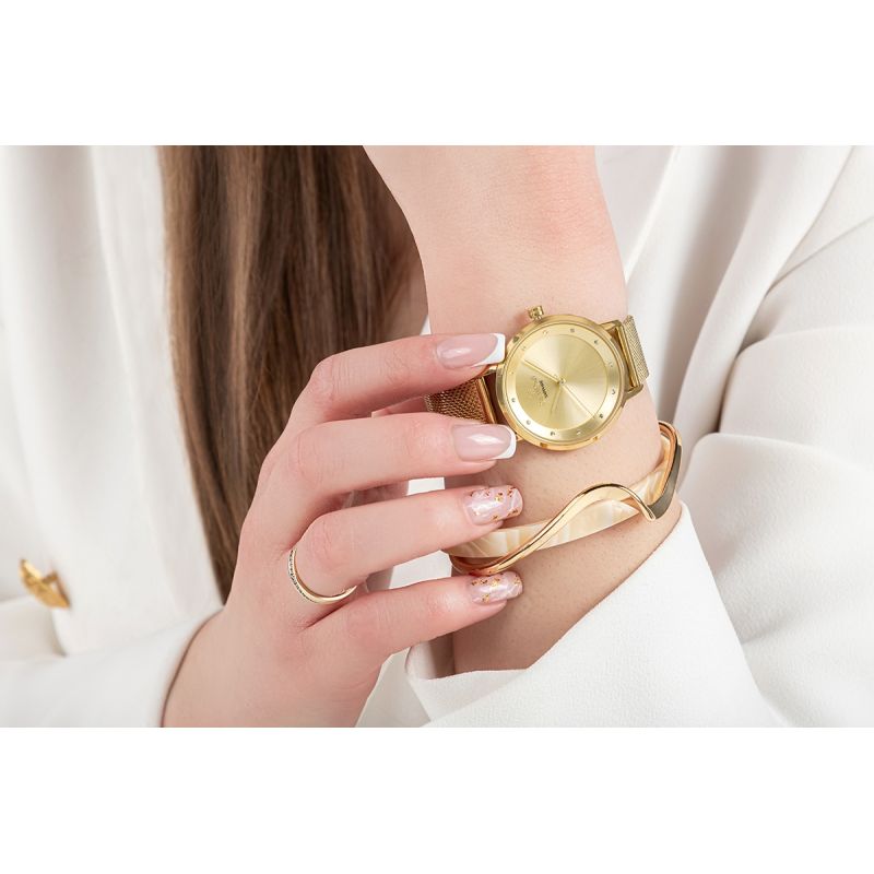 Das Mesh-Armband verfügt über einen praktischen, verstellbaren Verschluss, der eine präzise Passform ermöglicht. Diese Lösung vereint Ästhetik und Funktionalität und sorgt so für ganztägigen Tragekomfort.