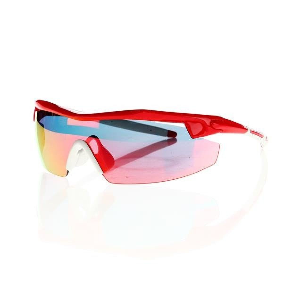 Sport-Sonnenbrille mit drei auswechselbaren Gläsern. Sie bietet 100%igen Schutz vor schädlicher UVA- und UVB-Strahlung (UV 400). Inklusive praktischer Schutzbox. Gläser: - mit Filter der Kategorie 3, Lichtdurchlässigkeit: 8-18% - gelb mit Filter der Kategorie 1, Lichtdurchlässigkeit: 43-80% - klar mit Filter der Kategorie 0, Lichtdurchlässigkeit: 80-100% Rahmenfarbe: rot/weiß.