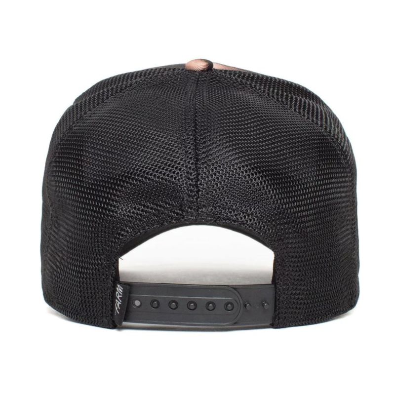 Eine braun-schwarze Truckerkappe mit einem Goorin Bros Jacquard-Etikett auf dem Schirm.