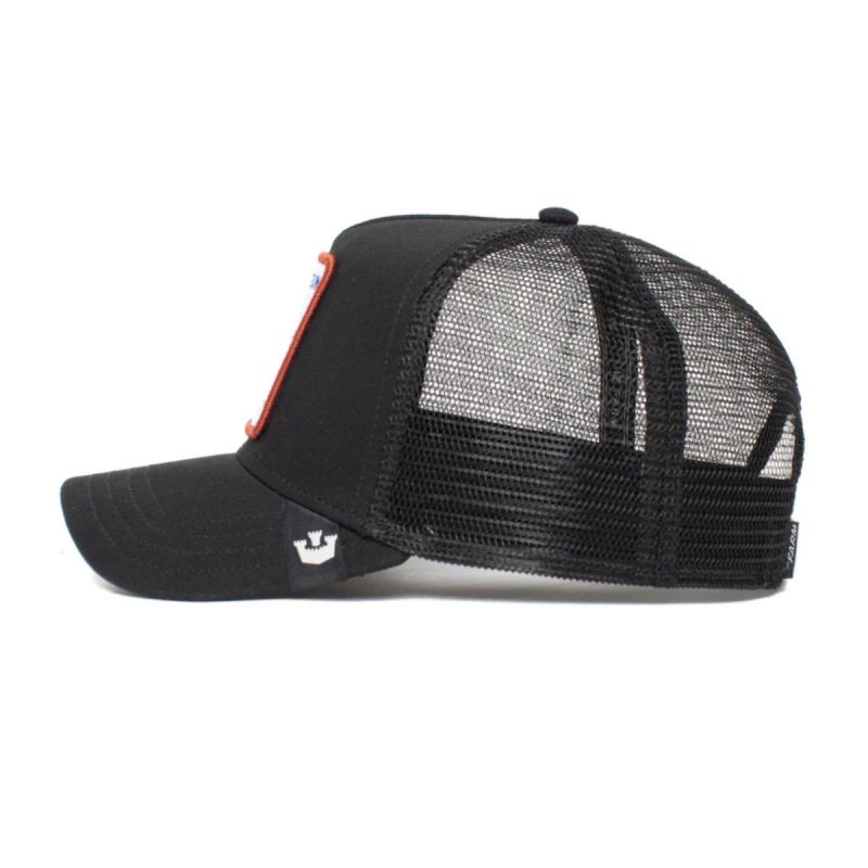 Schwarze Truckerkappe mit Goorin Bros Jacquard-Etikett auf dem Schirm.